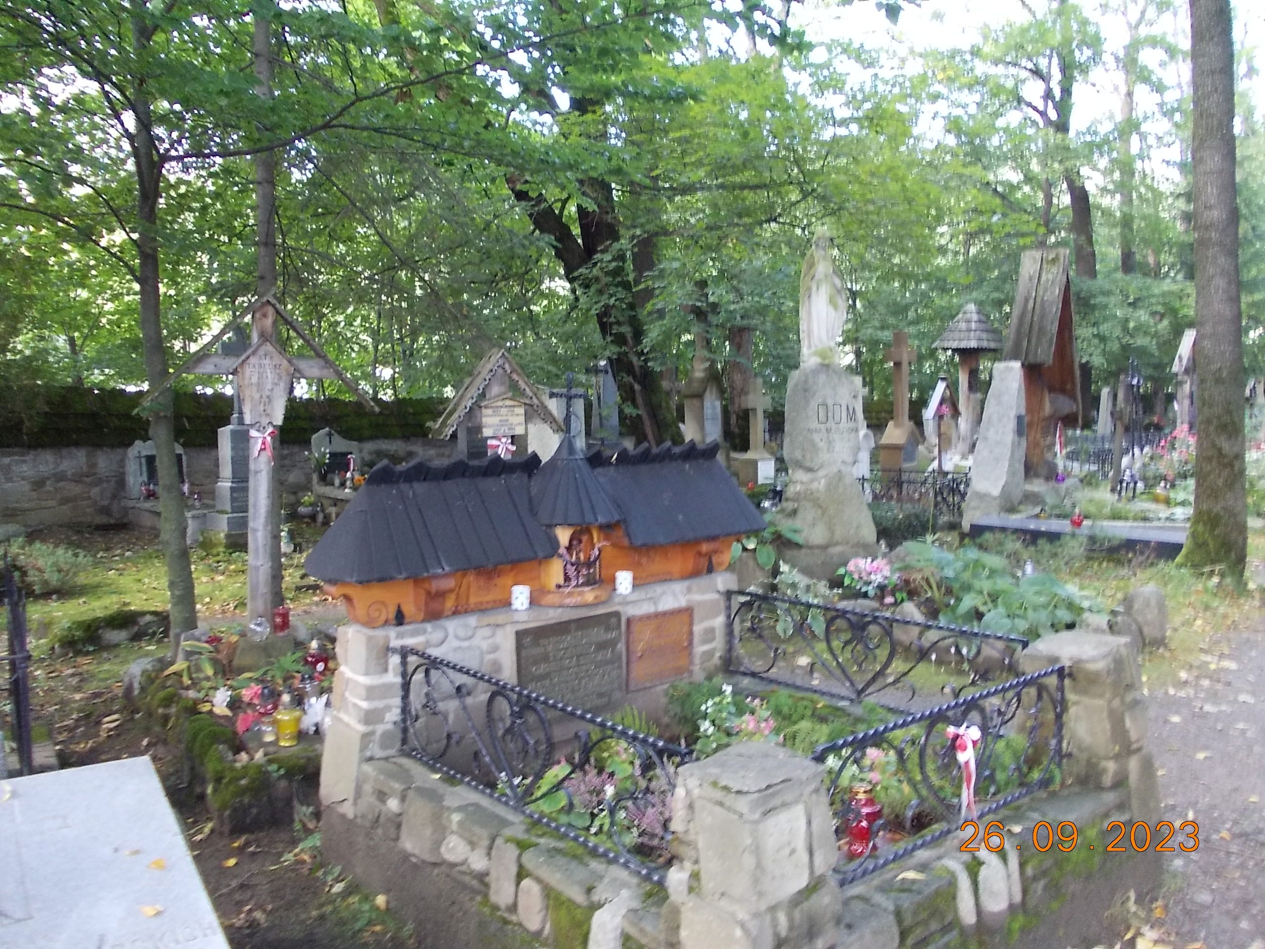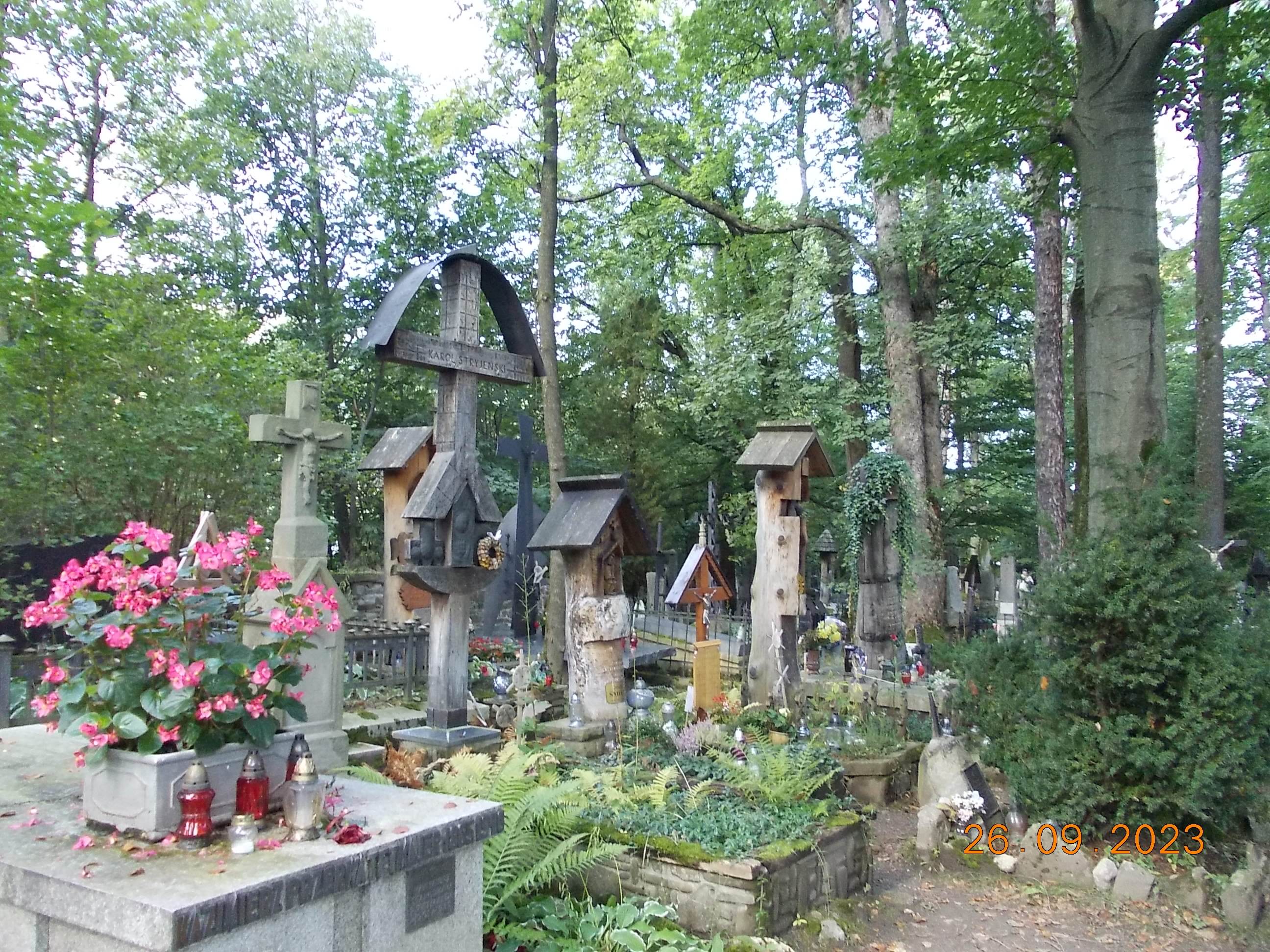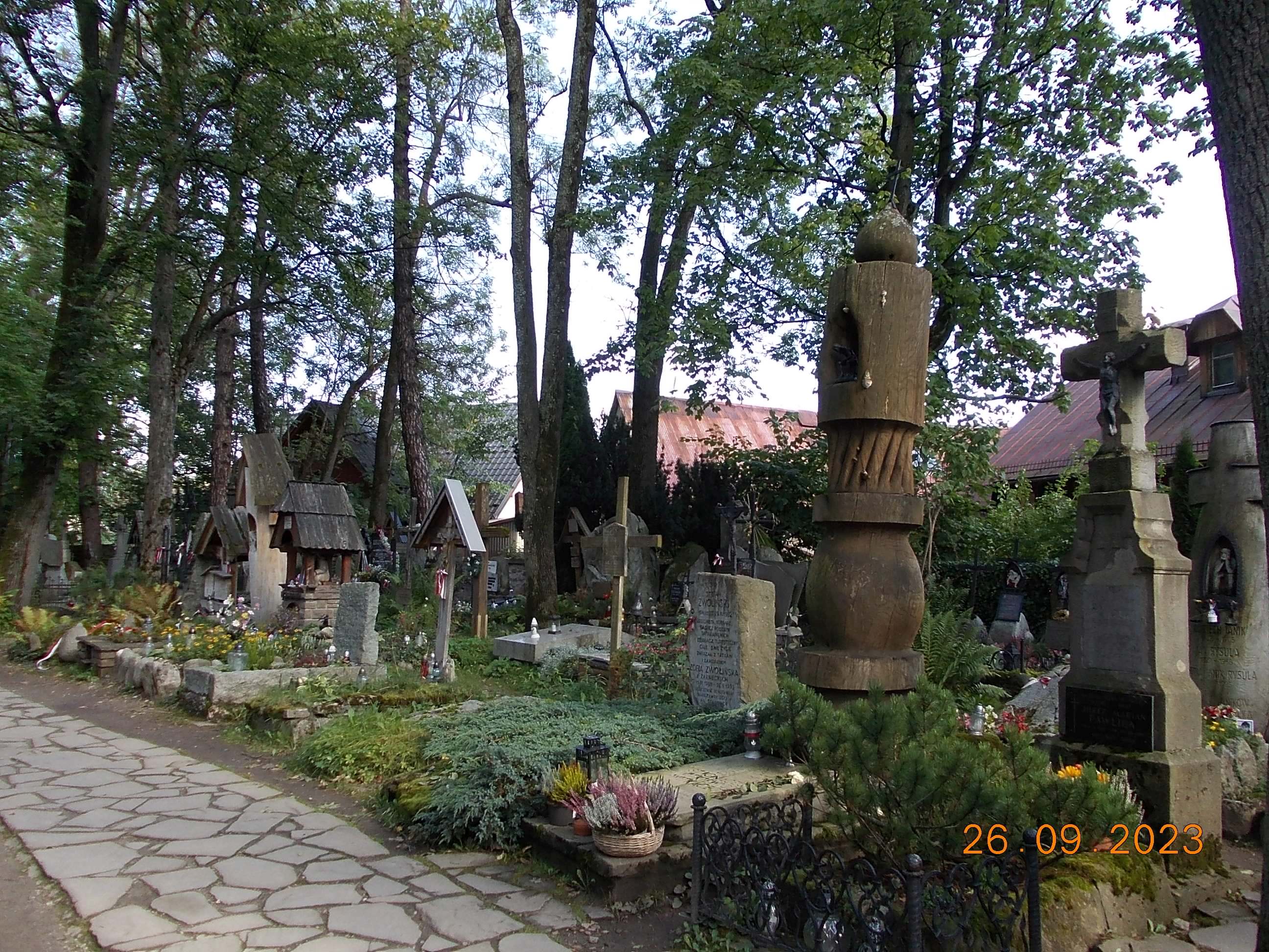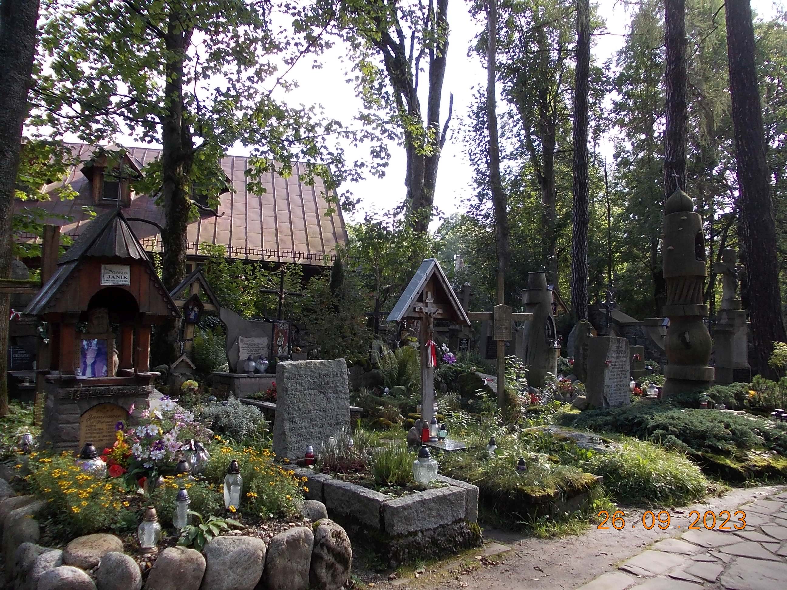 We wtorek już całą drużyną od rana spotkaliśmy się w Zakopanem w Ośrodku „Geovita” w naszej bazie rajdowej i po wypakowaniu bagaży ruszyliśmy przez Krupówki na Gubałówkę, dołączyły do nas dwie panie czyli moja żona Bożena oraz koleżanka Lidka ze Strzelec Opolskich, dojeżdżające do nas z Bukowiny Tatrzańskiej. I jak to bywa część poszła pieszo na Gubałówkę szlakiem czarnym ale też część podjechała kolejką jako atrakcją. Droga powrotna to żółty szlak i pod wyciągiem na Polanie Szymaszkowiej powrót na dół do Zakopanego a tu jeszcze wybraliśmy się do drewnianego kościoła MB Częstochowskiej oraz spacer po Cmentarzu Zasłużonych na Pęskowym Brzysku. Można tu odnaleźć groby naszych sportowców jak Stanisław Marusarz, Helena Marusarzówna, poeta Kornel Makuszyński, Władysław Orkan, Kazimierz Przerwa- Tetmajer a także innych znanych zakopiańczyków Tytus Chałbiński, Sabała czy też symboliczny grób Stanisława Witkiewicza. Naprawdę warto poświęcić krótką chwilę na zadumę i zobaczyć te pięknie wykonane nagrobki, kapliczki góralskie krzyże czy rzeźbione motywy podhalańskie. W drodze do ośrodka oczywiście zdjęcie na tle napisu ZAKOPANE a także przy pomniku Józefa Kurasia „Ognia”.