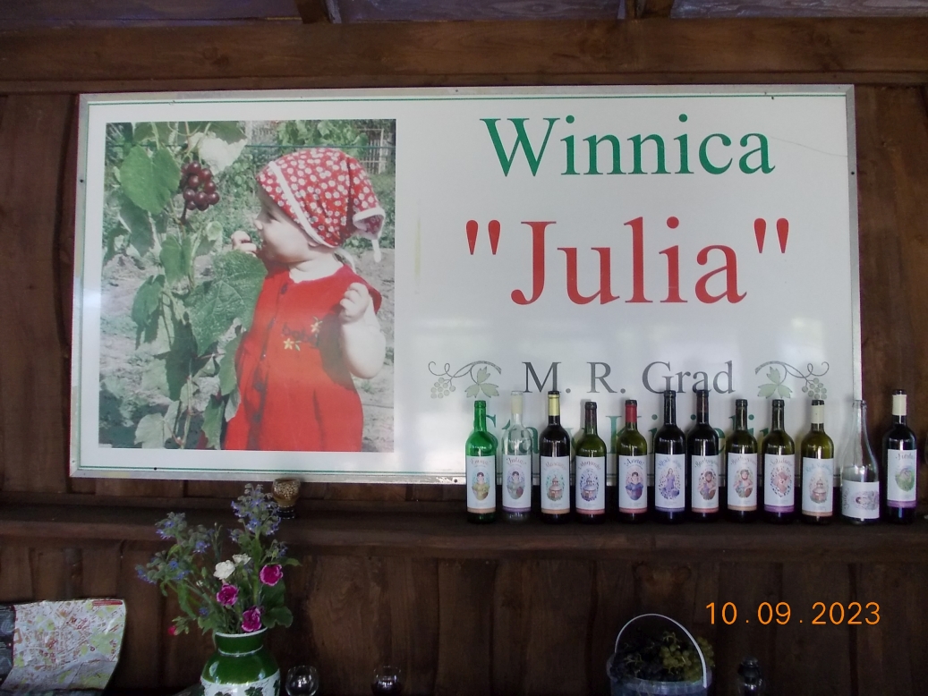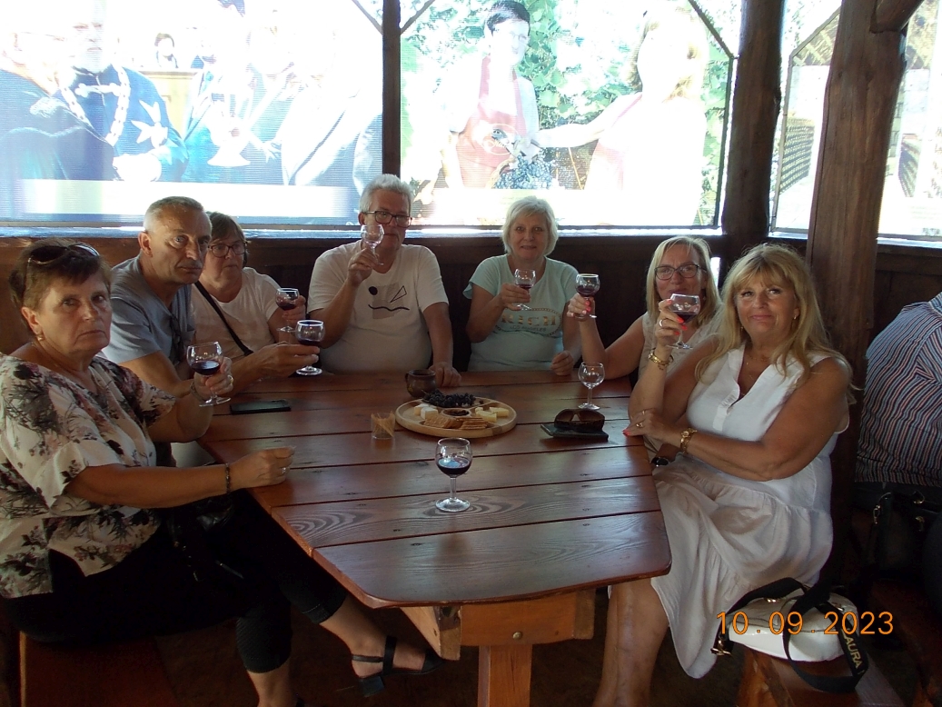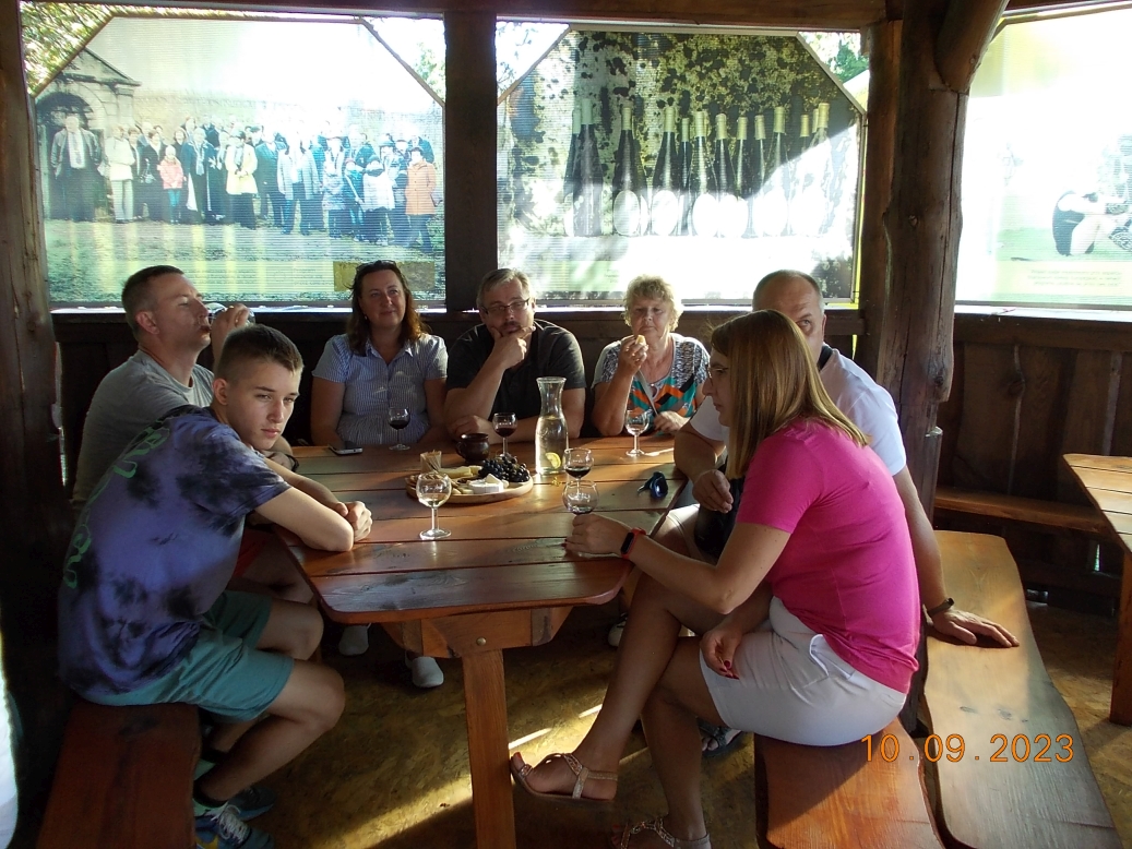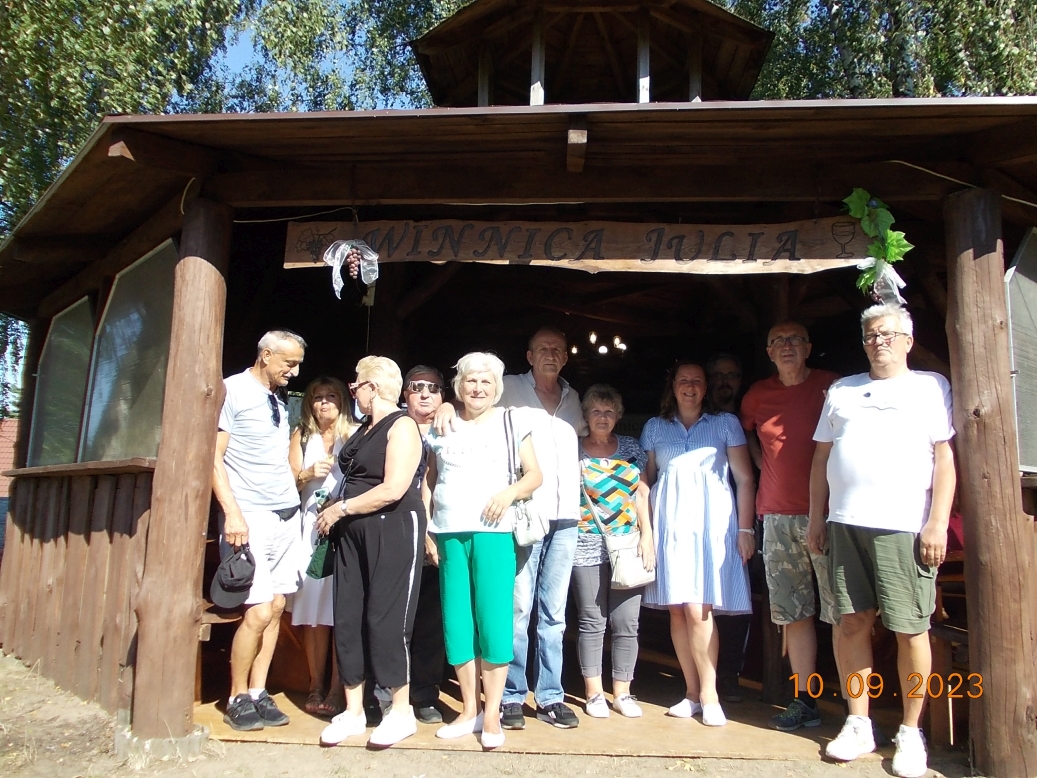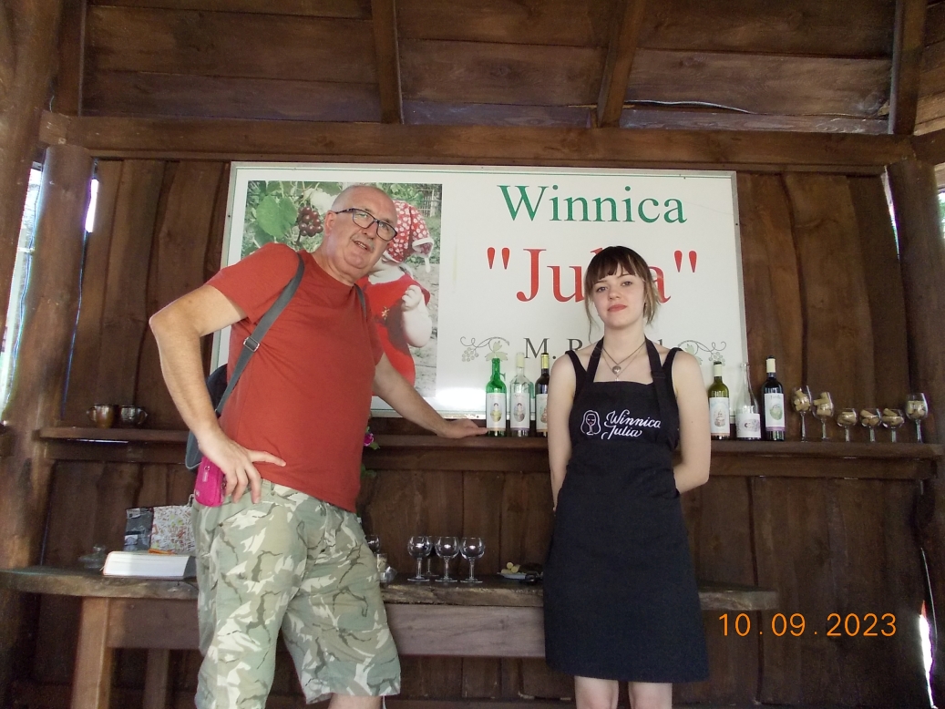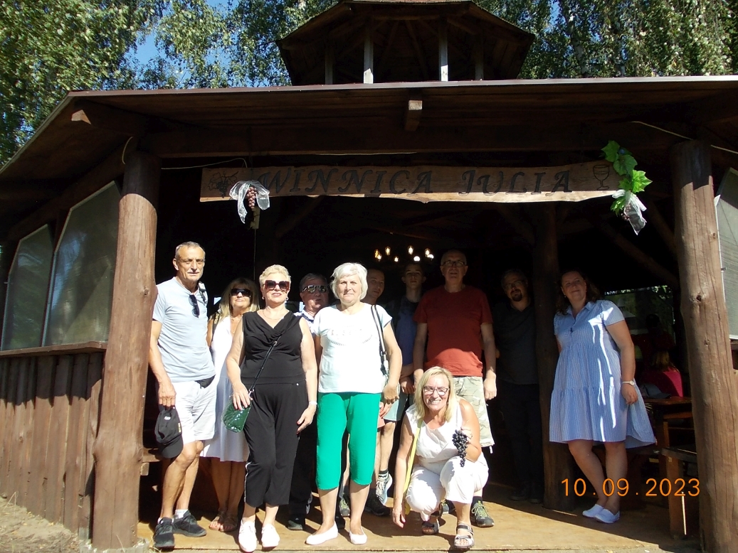 Zaczynamy od Winnego Wzgórza i znajdującej się na nim Zielonogórskiej Palmiarni. W samej Palmiarni podziwiamy wysokie palmy oraz przepiękne akwaria z rybkami. Na parterze zachwycamy się także przepięknym zegarem. Schodami oraz windą docieramy aż na ostatnią kondygnację Palmiarni (gorąco jak w saunie) skąd rozprzestrzenia się przepiękny widok na miasto. Na terenie Winnego Wzgórza spotykamy też pierwsze „bachusiki” (to dzieci Bachusa, rzymskiego boga wina), a w Zielonej Górze można znaleźć ich już ponoć ponad 60 sztuk (oczywiście każdy wygląda inaczej i każdy ma swoje imię). Oczywiście nie obyło się bez sesji zdjęciowych. Schodząc ze Wzgórza zatrzymujemy się przy pomniku „Chłopiec ze źrebięciem”. Dalej ruszamy już w stronę miasta po drodze zatrzymując się przy pomniku „W hołdzie Żołnierzom Wyklętym” i dochodzimy do Konkatedry p.w. św. Jadwigi i pobliskiego muralu upamiętniającego Wydarzenia Zielonogórskie z 1960 r. czyli bunt mieszkańców przeciwko odebraniu przez władze Domu Katolickiego. I tak spacerując obok Bramy Łaziebnej (ze spacerującym po nim kolejnym Bachusiku i obok Uniwersytetu Zielonogórskiego (gdzie także witał nas Bachusik) docieramy do centrum gdzie witają nas stoiska winne i oczywiście niezliczona liczba Bachisików. Przedzieramy się pomiędzy stoiskami i scenami gdzie występują artyści i docieramy na Pl. Powstańców Wielkopolskich do Pomnika św. Urbana I czyli Patrona Zielonej Góry oraz w pobliżu Filharmonii odnajdujemy pęknięte serce Wielkiej Orkiestry Świątecznej upamiętniające zamordowanego Prezydenta Gdańska Pawła Adamowicza. Zatrzymujemy się także przy Pomniku Dobosza Powstania Wielkopolskiego 1918/1919, który jest poświęcony uczestnikom powstania wielkopolskiego, a także wszystkim dzieciom biorącym udział w walkach zbrojnych na przestrzeni wieków. I w końcu docieramy do najważniejszego czyli pomnika samego „Bachusa„”(to bóg winorośli i urodzaju), który jest zlokalizowany jest przy ulicy Żeromskiego i Kupieckiej, a obok niego można odnaleźć innego ciekawego „Bachusika” czyli Policjanta. Tutaj też zatrzymujemy się na dłużej kilka fotek i oczywiście oglądając stragany winne (a było na co patrzeć, tyle było tych butelek, straganów oraz ogródków). Po prawie trzech godzinach spaceru wracamy na Winne Wzgórze gdzie robimy kilka fotek w tym na tle napisu „Zielona”, żegnamy się z naszą Panią Przewodnik i autokarem ruszamy do następnej atrakcji czyli Zielonogórskiej Winnicy „JULIA” w Starym Kisielinie, gdzie przywitał nas właściciel Pan Roman Gradów, a następnie oprowadził po winnicy opowiedział historię jej powstania, okres teraźniejszy a także oprowadził nas po Parku Miniatur Obiektów Winiarskich. Na koniec oczywiście w drewnianej altanie odbyła się degustacja trzech win „Fiesta”, „Anna” i „Muscaris” zaproponowanych przez właściciela. Spotkanie zakończyło się wpisem do księgi gości i zakupami. W winnicy spędziliśmy dwie godziny. Zmęczeni intensywnością dnia a także upałem, w dobrych nastrojach wsiedliśmy do autokaru w drogę powrotną do Kalisza.