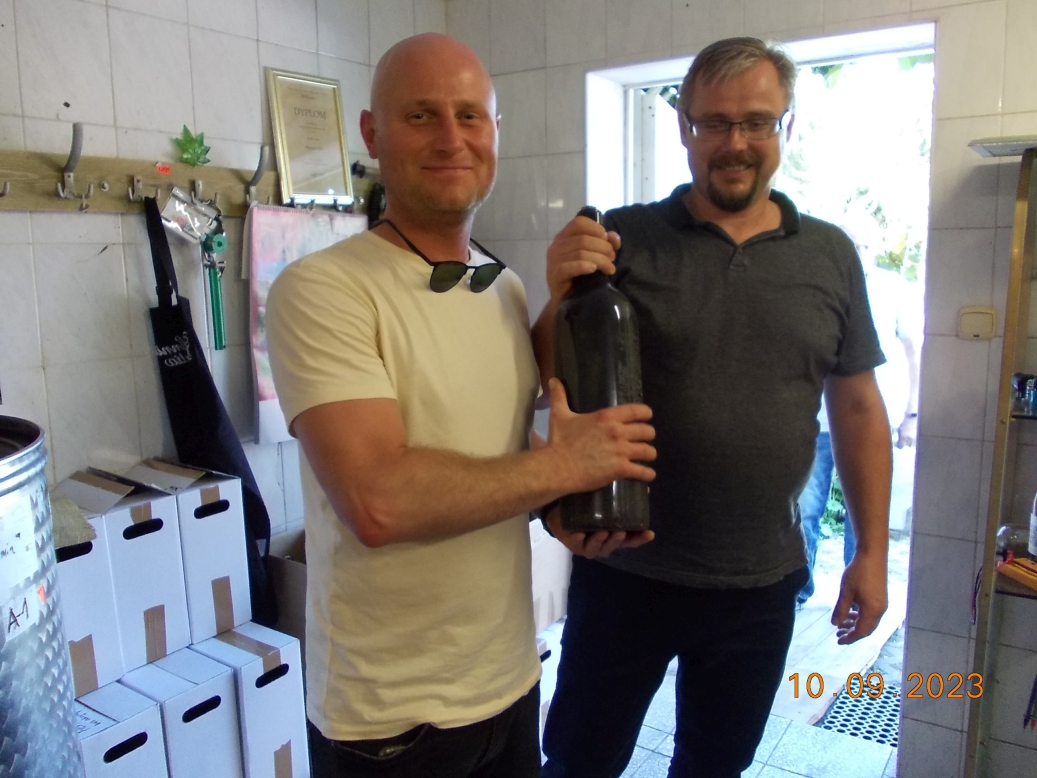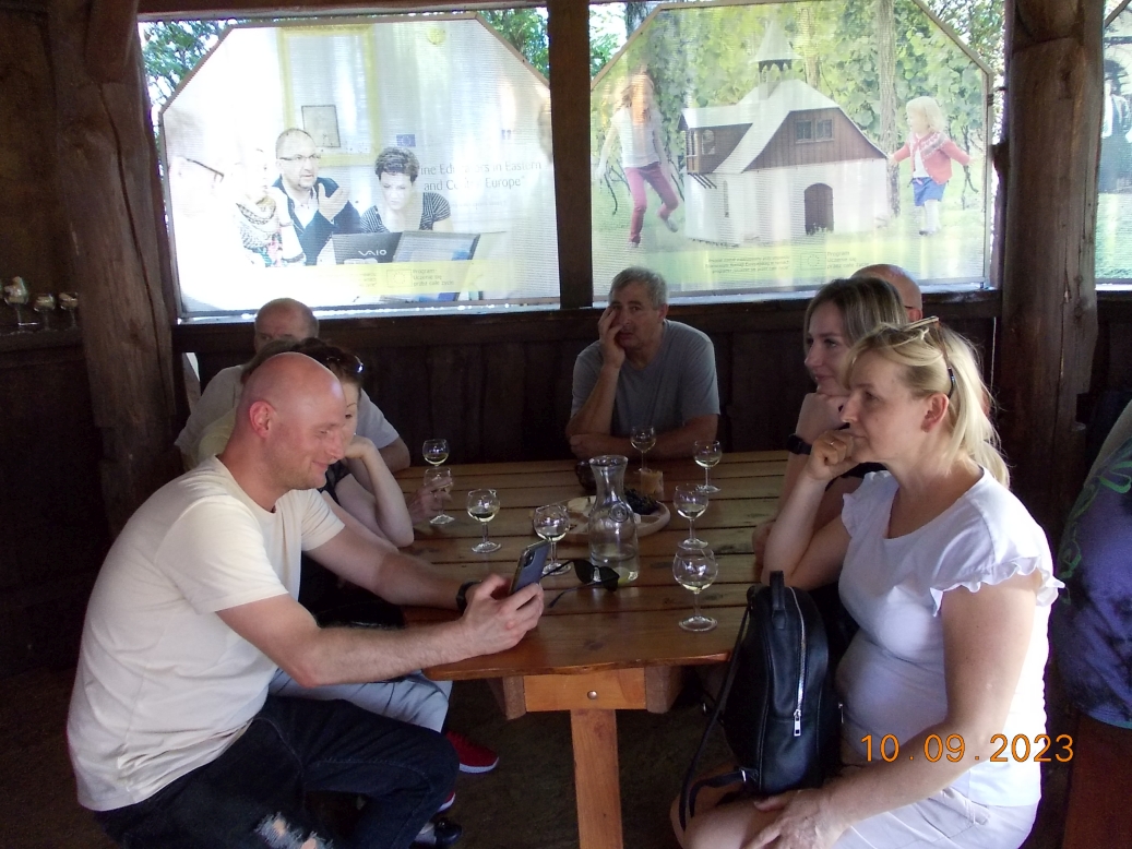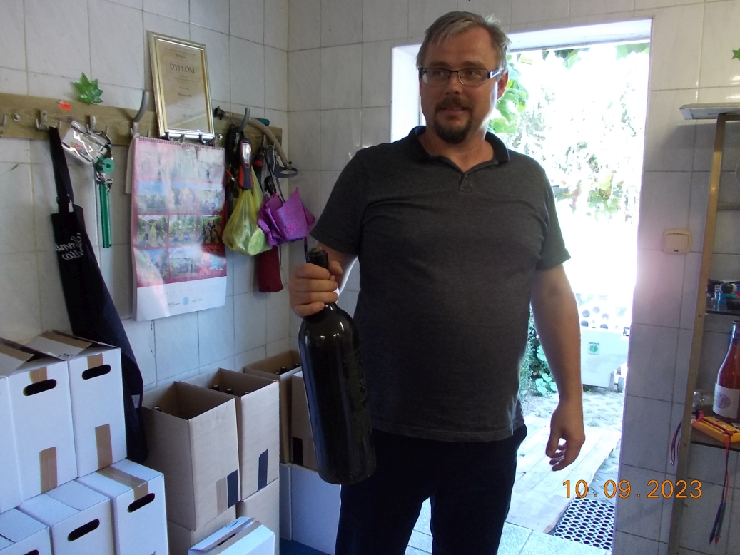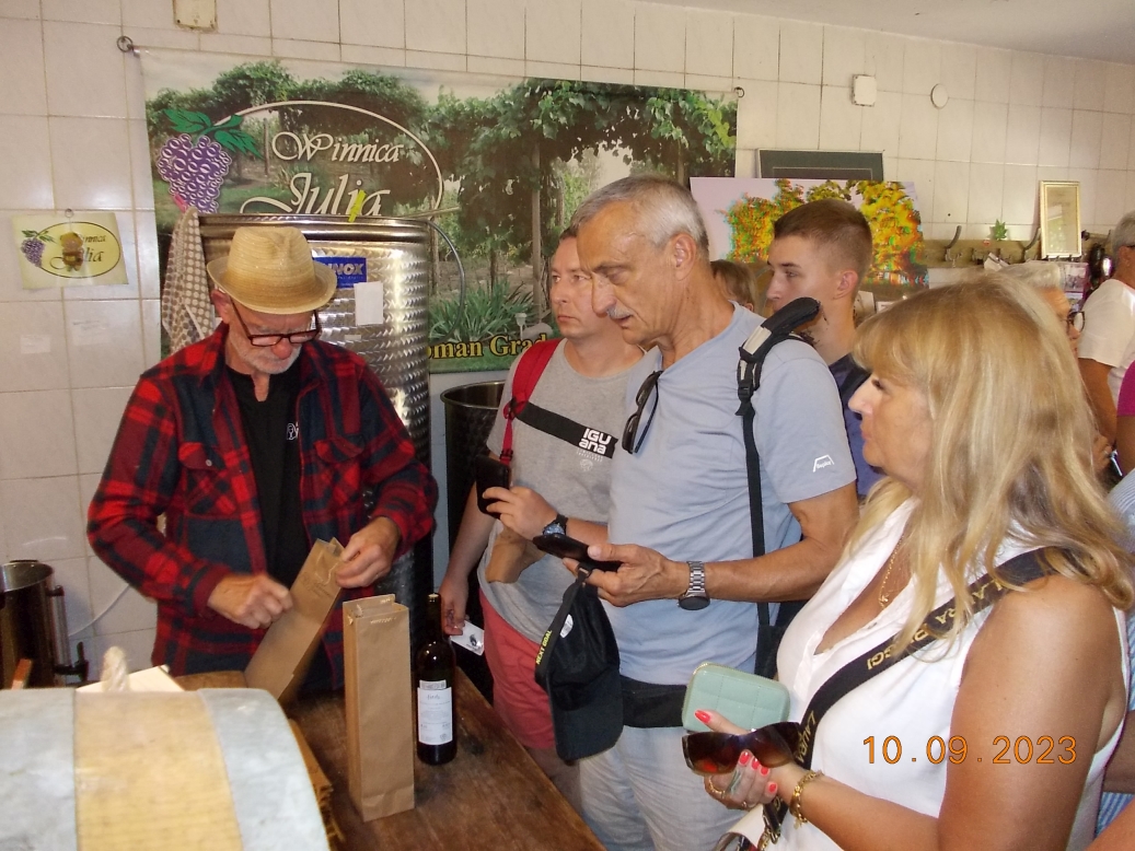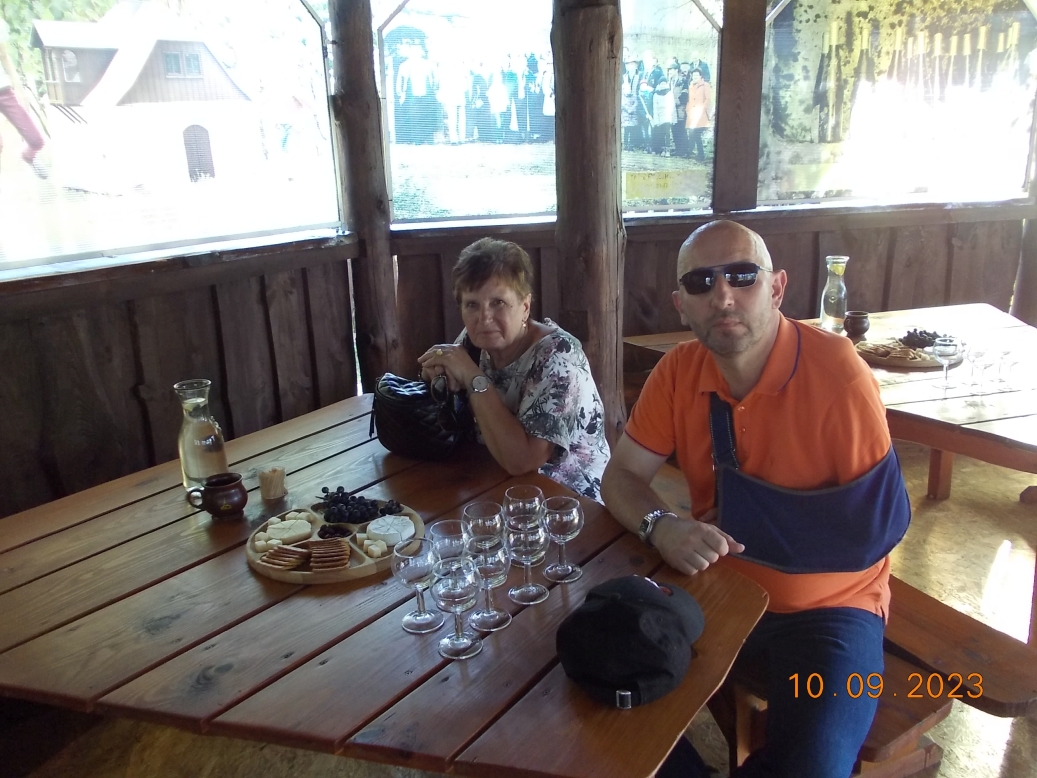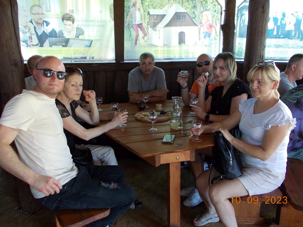 Zaczynamy od Winnego Wzgórza i znajdującej się na nim Zielonogórskiej Palmiarni. W samej Palmiarni podziwiamy wysokie palmy oraz przepiękne akwaria z rybkami. Na parterze zachwycamy się także przepięknym zegarem. Schodami oraz windą docieramy aż na ostatnią kondygnację Palmiarni (gorąco jak w saunie) skąd rozprzestrzenia się przepiękny widok na miasto. Na terenie Winnego Wzgórza spotykamy też pierwsze „bachusiki” (to dzieci Bachusa, rzymskiego boga wina), a w Zielonej Górze można znaleźć ich już ponoć ponad 60 sztuk (oczywiście każdy wygląda inaczej i każdy ma swoje imię). Oczywiście nie obyło się bez sesji zdjęciowych. Schodząc ze Wzgórza zatrzymujemy się przy pomniku „Chłopiec ze źrebięciem”. Dalej ruszamy już w stronę miasta po drodze zatrzymując się przy pomniku „W hołdzie Żołnierzom Wyklętym” i dochodzimy do Konkatedry p.w. św. Jadwigi i pobliskiego muralu upamiętniającego Wydarzenia Zielonogórskie z 1960 r. czyli bunt mieszkańców przeciwko odebraniu przez władze Domu Katolickiego. I tak spacerując obok Bramy Łaziebnej (ze spacerującym po nim kolejnym Bachusiku i obok Uniwersytetu Zielonogórskiego (gdzie także witał nas Bachusik) docieramy do centrum gdzie witają nas stoiska winne i oczywiście niezliczona liczba Bachisików. Przedzieramy się pomiędzy stoiskami i scenami gdzie występują artyści i docieramy na Pl. Powstańców Wielkopolskich do Pomnika św. Urbana I czyli Patrona Zielonej Góry oraz w pobliżu Filharmonii odnajdujemy pęknięte serce Wielkiej Orkiestry Świątecznej upamiętniające zamordowanego Prezydenta Gdańska Pawła Adamowicza. Zatrzymujemy się także przy Pomniku Dobosza Powstania Wielkopolskiego 1918/1919, który jest poświęcony uczestnikom powstania wielkopolskiego, a także wszystkim dzieciom biorącym udział w walkach zbrojnych na przestrzeni wieków. I w końcu docieramy do najważniejszego czyli pomnika samego „Bachusa„”(to bóg winorośli i urodzaju), który jest zlokalizowany jest przy ulicy Żeromskiego i Kupieckiej, a obok niego można odnaleźć innego ciekawego „Bachusika” czyli Policjanta. Tutaj też zatrzymujemy się na dłużej kilka fotek i oczywiście oglądając stragany winne (a było na co patrzeć, tyle było tych butelek, straganów oraz ogródków). Po prawie trzech godzinach spaceru wracamy na Winne Wzgórze gdzie robimy kilka fotek w tym na tle napisu „Zielona”, żegnamy się z naszą Panią Przewodnik i autokarem ruszamy do następnej atrakcji czyli Zielonogórskiej Winnicy „JULIA” w Starym Kisielinie, gdzie przywitał nas właściciel Pan Roman Gradów, a następnie oprowadził po winnicy opowiedział historię jej powstania, okres teraźniejszy a także oprowadził nas po Parku Miniatur Obiektów Winiarskich. Na koniec oczywiście w drewnianej altanie odbyła się degustacja trzech win „Fiesta”, „Anna” i „Muscaris” zaproponowanych przez właściciela. Spotkanie zakończyło się wpisem do księgi gości i zakupami. W winnicy spędziliśmy dwie godziny. Zmęczeni intensywnością dnia a także upałem, w dobrych nastrojach wsiedliśmy do autokaru w drogę powrotną do Kalisza.